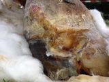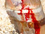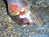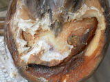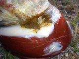 Nach ein Paar Wochen verschlechterte sich die Situation und es kam ca. 4 cm lateral, oberhalb der Krone zu einem eitrigem Austritt. Tiermedizinisch wurde die Fistel etwas bagatellisiert und eine Therapie wie bisher angeordnet (Verband, warten, Verband).