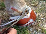 Nach wiederholtem Verdacht für einen Abszess konnte ich die Richtung des Abszesses ausrechnen und etwa in der Hälfte der Hufkapsel einen Kanal aufgeschnitten. Die Sohle war zum wiederholtem Mal unterminiert. Danach Verband und Krankenschuh. Zwischendurch waren die Symptome weg, allerdings nicht lange.
