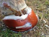 Dafür nahm ich eine breitere Schalle des Klebebeschlages als der Huf es war, die ich lateral hervorstehen lies. In die so entstandene Aussparung goss ich eine gute Menge Kunsthorns, welche durch seine Stärke die lädierte Hufwand stärkte. Allerdings blieb die aufgeschnittene Hufwand nicht verklebt. Das Risiko eines Infektes, der sich hier entwickeln könnte war zu gross. Trotzdem legte ich eine Drainage aus einem Stück Gummiband an. Nur so für alle Fälle.