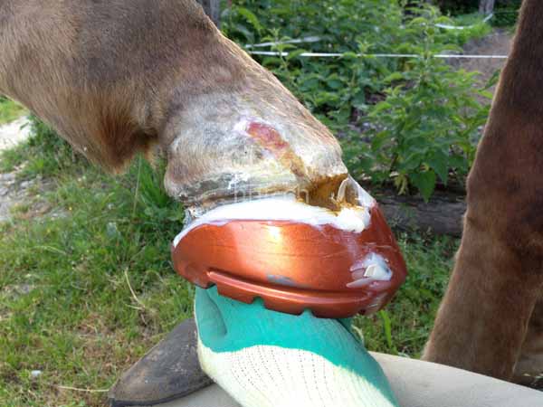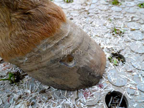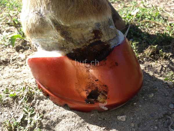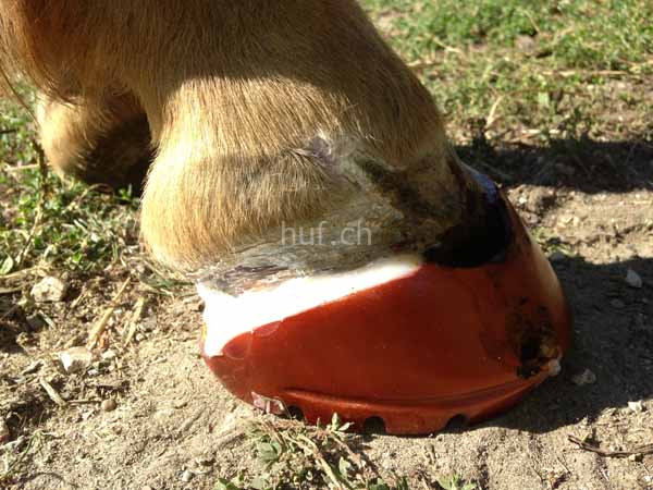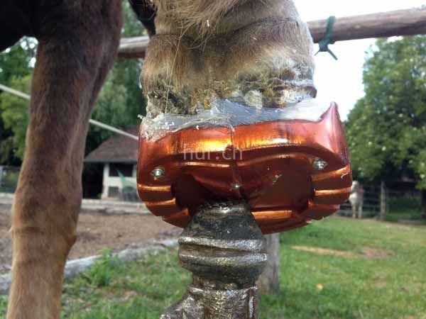 Tiermedizinisch wurde eingelenkt und ein medikamentöser Schutz eingeleitet. So konnte man aber den „demolierten“ Huf nicht ohne eines mechanischen Schutzes lassen. Eigentlich erinnerte der Huf zu diesem Zeitpunkt eher einer Klaue als einem Huf.