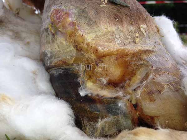 Nach wiederholtem wechseln des Beschlages erholt sich der Huf sehr gut, und das Horn wächst wieder von oben zwar vernarbt, aber gesund hinunter.