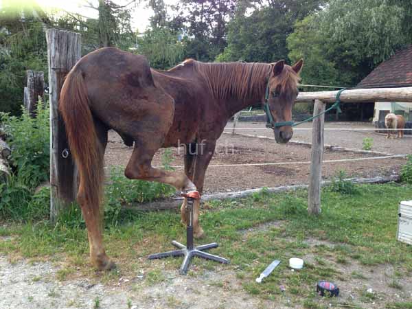 Nach etwa drei Wochen bekam das Pferd einen Klebebeschlag. Damit es nicht so einfach wäre, war es eine Sonderanfertigung.