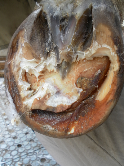 Ein schmale Kanal im lateralem Teil der Weissen Linie konnte nicht eindeutig ein Abszess ausschliessen. Ein paar Tage ein Angusverband angelegt. Danach konnte man den Abszessherd samt allen „Nebenhöhlen“ sauber ausschneiden.