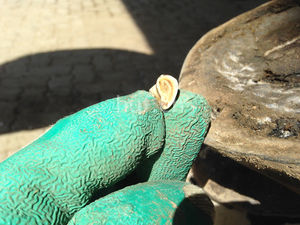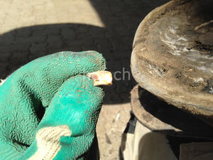 Vor ein paar Tagen, als ich vor der Hufbearbeitung die Hufe eines Pferdes auskratzen wollte, fiel mir ein ungewöhnlicher Fremdkörper in der Weissen Linie eines vorderen Hufes auf.
