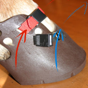 Manche Hufschuhe neigen dazu, sich am Huf zu drehen. Am einfachsten erklärt man es so: "Der Hufschuh sucht sich die optimale Position am Huf, welche zu seiner Form passt."