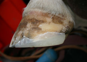 Eine einfache Variante wäre zum Beispiel kurzzeitig einen Keil zwischen dem Beschlag und dem Huf ein- oder beidseitig zu platzieren, um die Verletzten Bereiche zu entlasten. Abgesehen von vielen Nachteilen die solche Lösung mit sich bringt (langsamer wachsende Trachtenwände, Verängung der Blutgefässe...), ist sie nur bei beschlagenen Pferdhufen möglich.