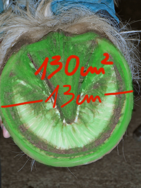 Bei einem Hufdurchmesser von 13 cm, entsteht hier eine Auflagefläche von ca. 130 cm2.