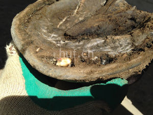 Vor ein paar Tagen, als ich vor der Hufbearbeitung die Hufe eines Pferdes auskratzen wollte, fiel mir ein ungewöhnlicher Fremdkörper in der Weissen Linie eines vorderen Hufes auf.