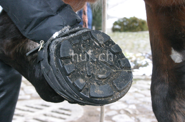 Sein Profil gibt dem Pferd einen guten Halt. Er muss nicht speziell angepasst werden – sollte die Schuhgrösse nicht ganz passen, schaffen Einlagen Abhilfe, die vom Pfer- debesitzer einfach und schnell mittels Klettverschluss angebracht werden können. Dadurch wird der Schuh allerdings recht klobig.