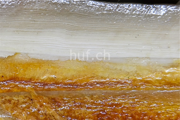 Sie erinnert an die Borsten eines Besens, dass im Silikon oder Leim eingegossen wurden. Die "Borsten" die am nähestem der stark durchbluteten Lederhaut anliegen, sind sehr locker mit der Kitsubstanz verklebt. Dadurch sind sie nicht sehr stabil aber sie können die Feuchtigkeit aus dem Huf besser weiterleiten. Diese Schicht nennt man den unpigmentierten Teil der Hufkapsel. Sie ist sehr weich. Deswegen dringt die Feuchtigkeit durch diese Schicht leichter nach aussen und sorgt so für die Elastizität der Hufkapsel.
