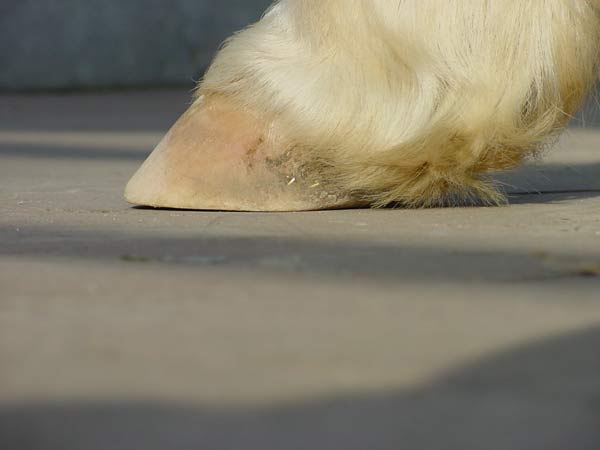 - Der Abstand der Sohle zum Boden ist ausschlaggebend für eine möglichst schmerzlose Umstellung. Haben einige Bereiche der Hufsohle auf ebenem Boden schon nach der Beschlagabnahme direkten Bodenkontakt, muss man mit Empfindlichkeit und fühligem Laufen rechnen.