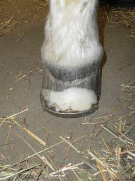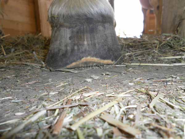 Bei einem Pferd hat sich innerhalb von wenigen Wochen die Zehenwand so stark abgenutzt, dass die Lederhaut nur wenige Millimeter Horn bedeckten. Weder ich, der Tierarzt noch die Osteopathin fanden eine eindeutige Ursache. Das Pferd wurde kaum noch geritten und war erst vor wenigen Monaten auf Barhuf umgestellt worden. Die Abnutzung des Hufes fand also im Auslauf statt. Beim vorderen rechten Huf war die Abnutzung besonders stark.